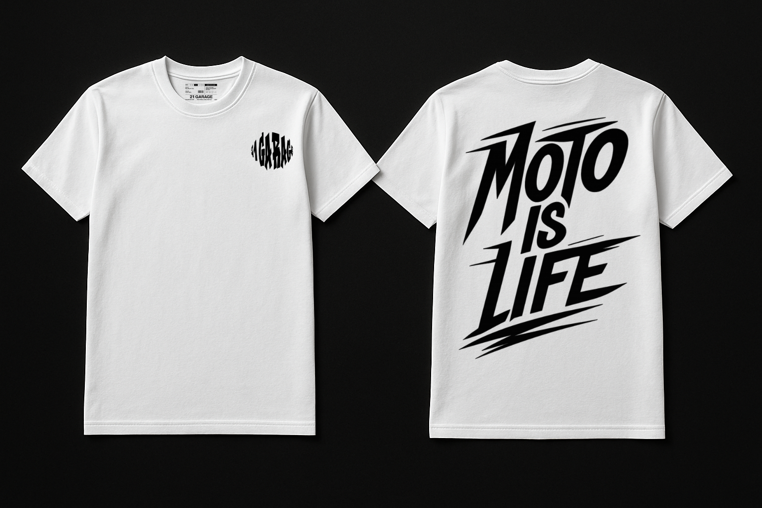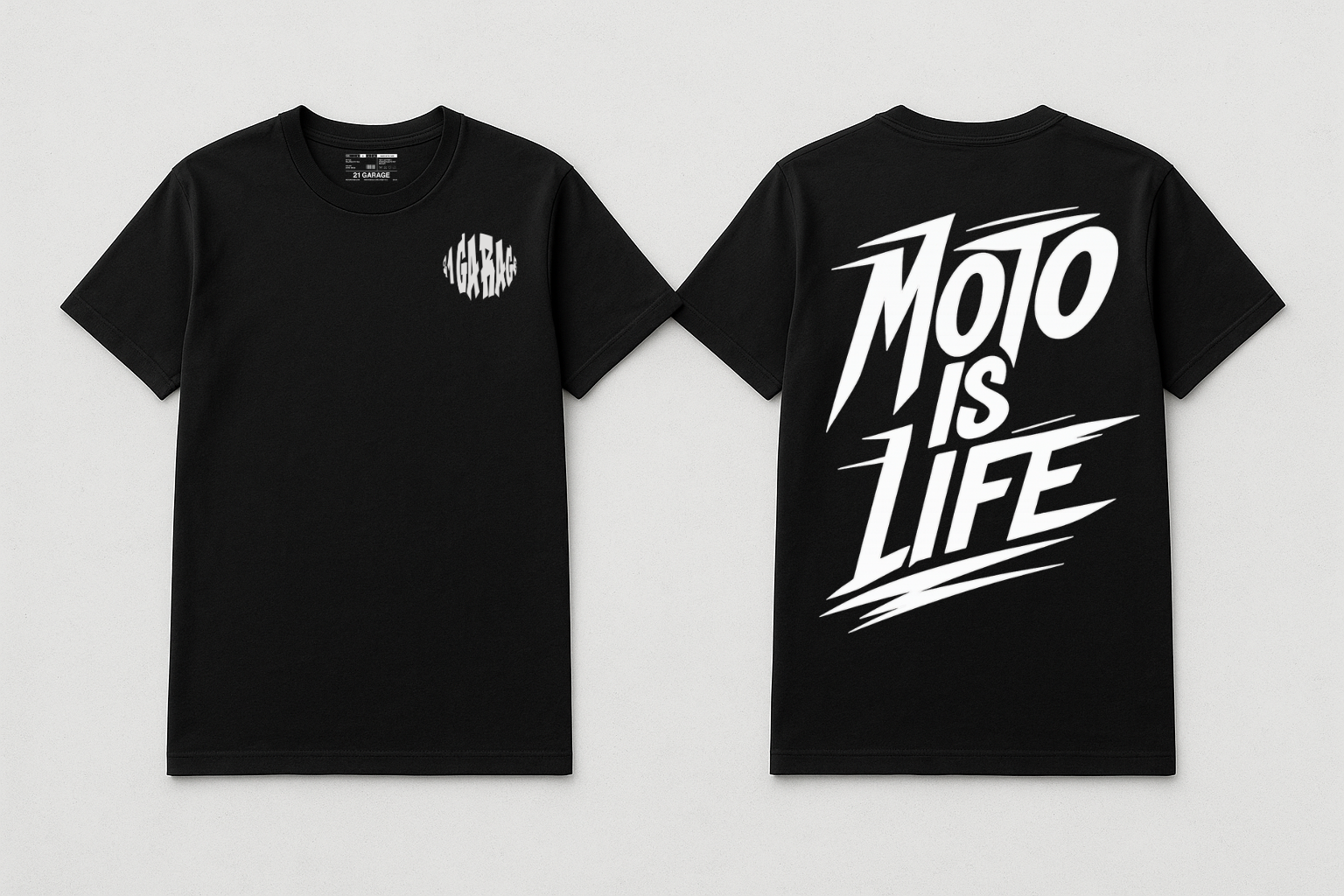 T-Shirt preta 100% algodão, com a logo 21 Garage à frente e estampa “MOTO IS LIFE” nas costas. Confortável, resistente e com muita atitude.