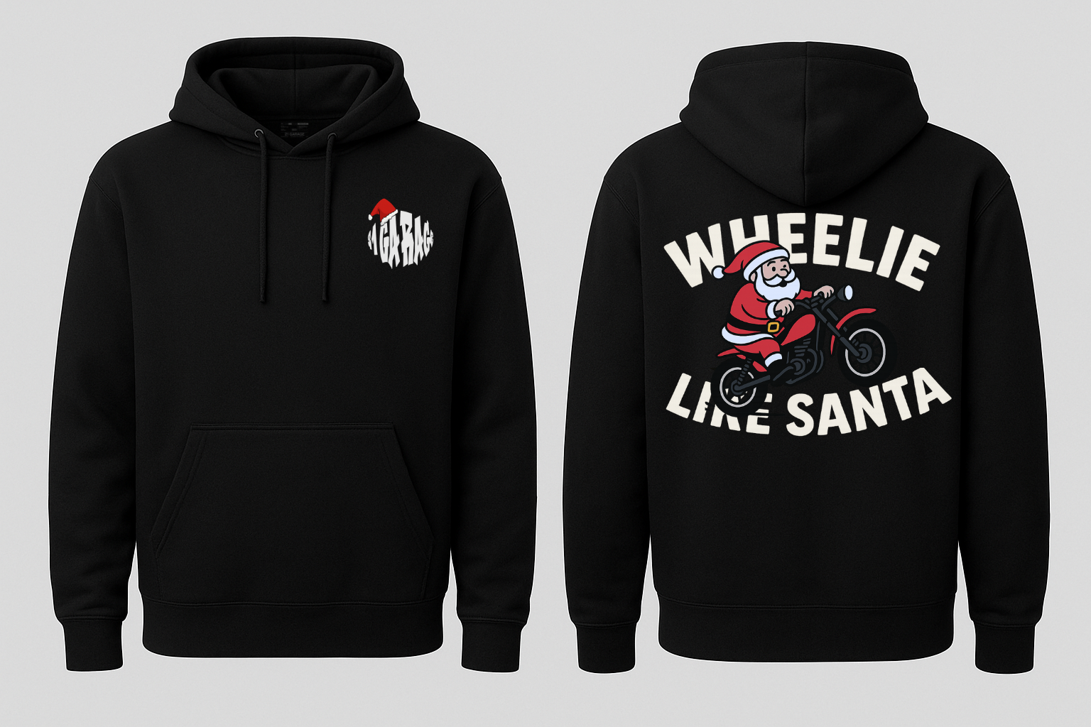 Sweat preta, quente e cheia de atitude, com o design exclusivo Wheelie Like Santa. À frente, o logótipo discreto da 21 Garage dá aquele toque clássico; nas costas, o Pai Natal a puxar um wheelie épico que diz tudo sem precisares de abrir a boca.